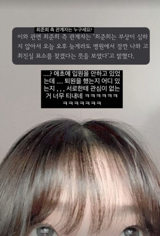 추모행사에 찾은 아들 최환희가 동생 최준희의 근황에 대해 교통사고로 참석하지 못했다고 얘기를 했었는데요. 그러나 딸 최준희는 "애초에 입원을 안 하고 있었는데.. 퇴원을 했는지 어디 있는지 서로한테 관심이 없는거 너무 티 내네"라며 SNS 글을 잠시 올린 뒤 삭제했습니다.